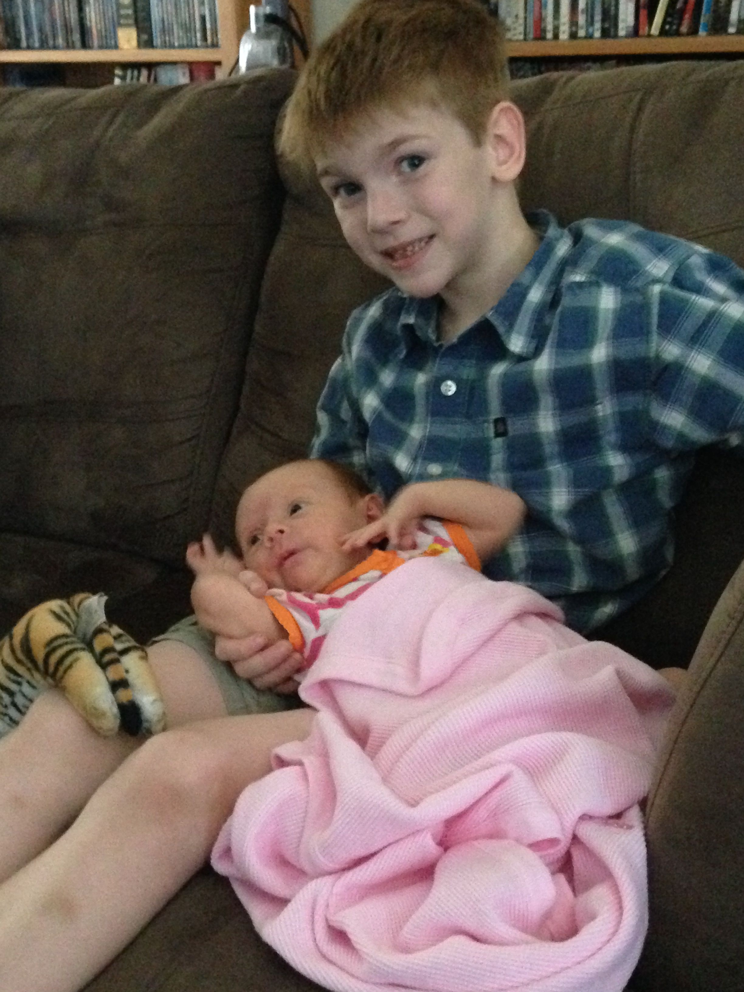 Our new special one is doing quite well.  At her 10 day checkup, she had regained all her baby weight loss since coming home and sprouted another 3″ in length.  As of today, she has gained more weight and her color is coming in nicely.  She’s got a little routine, which of course doesn’t match either mommy or brothers.  So little sleep is had by mommy.