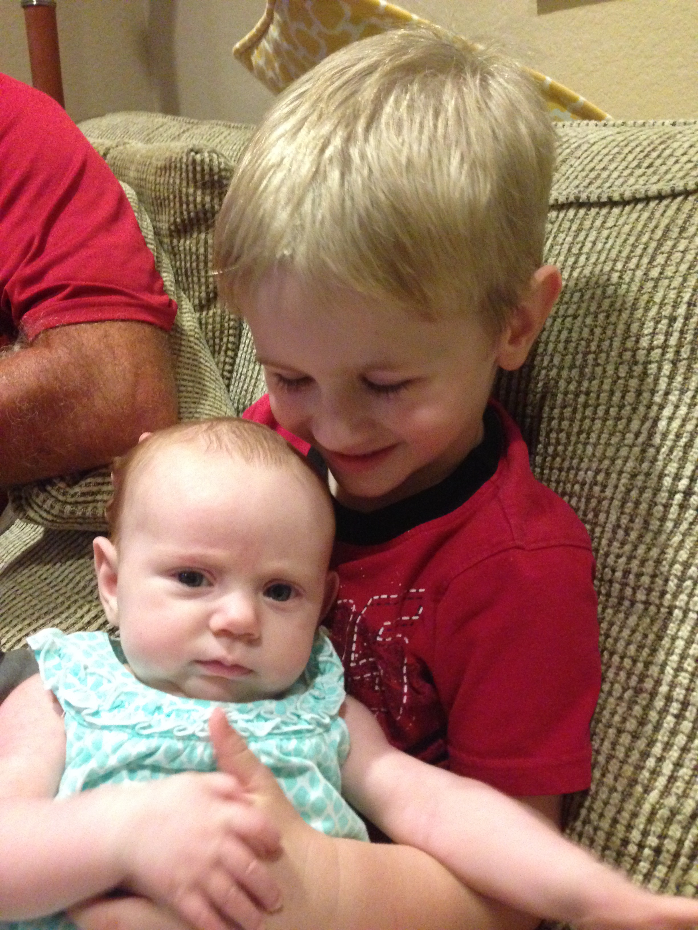 Next, this coming week, little Audrey will be three months old.  What a change she has brought to this family already.  Less sleep than we were already getting of course, but all the grunts, growls, and punching fists have totally flipped this family.  Her brothers are enamored with her and love helping as they can.  And that first smile, we were done.  Put a fork in us.